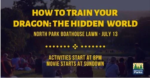 The July 13th movie is "HOW TO TRAIN YOUR DRAGON: The Hidden World" at the North Park Boathouse Lawn. Bring your blanket and/or chairs and join us for family activities and fun starting at 8:00pm. Movie starts at sunset.